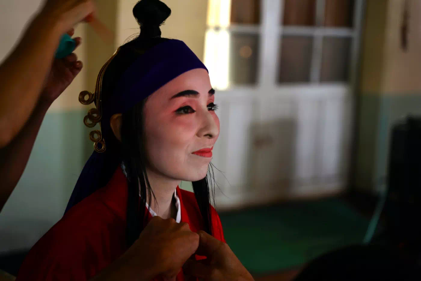 素敵な青い紅型を身にまとい、撮影のスタンバイ